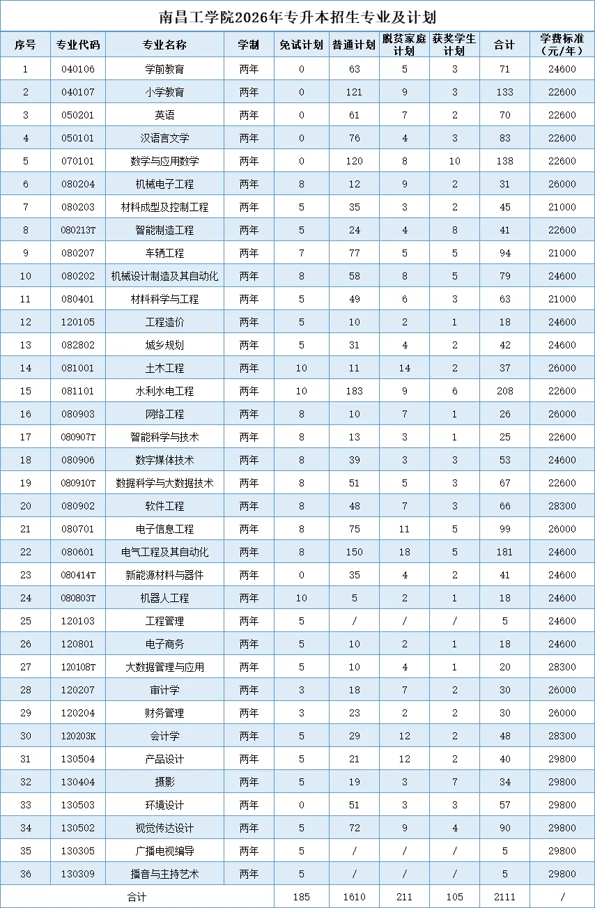 第十二条 学校2026年专升本总招生计划2111人,按专业对口原则实施招生。专升本招生计划通过学校网站等形式向社会公布,各专业招生计划详见《2026年南昌工学院专升本招生专业计划表》。
