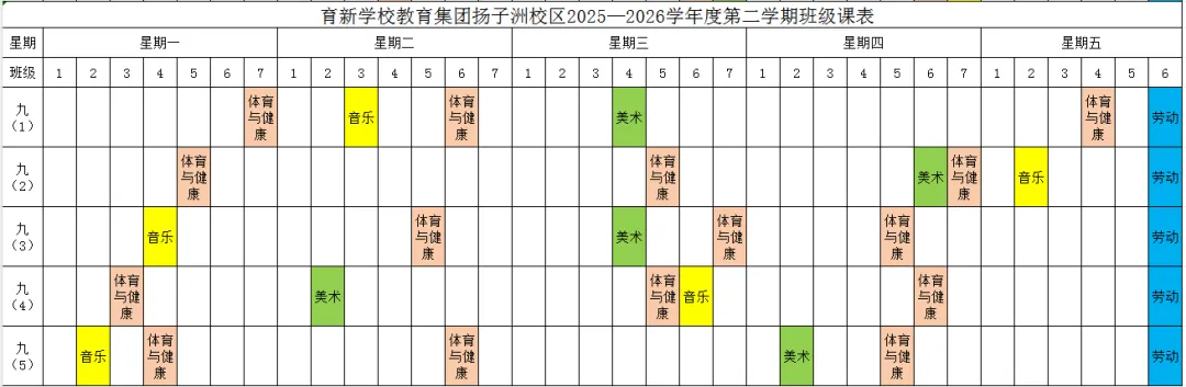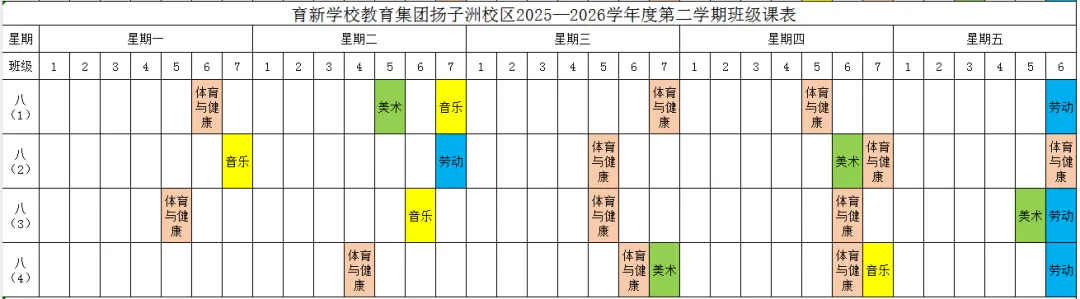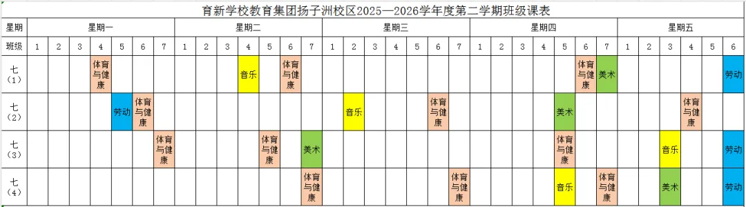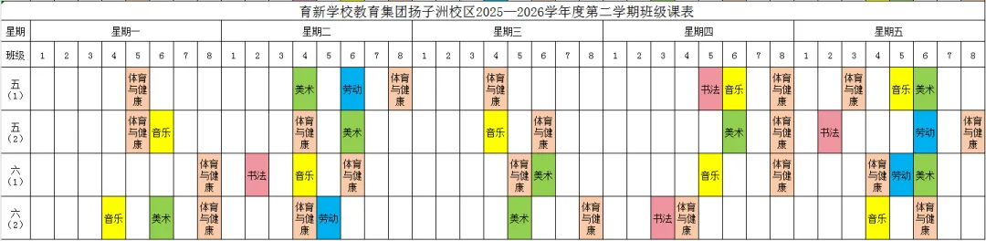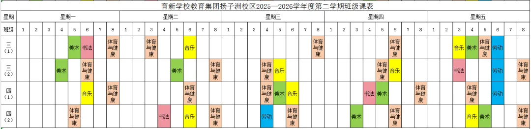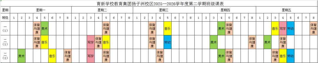 为深入贯彻落实江西省教育厅《关于开展中小学体育美育劳动教育“晒课表”的通知》和《关于全面加强和改进新时代学校美育工作的实施方案的通知》等文件精神,严格按照国家课程方案和课程标准开齐开足体育、美育、书法(写字)、劳动教育课,不以任何名义增加或缩减规定的课程、课时,结合育新学校教育集团扬子洲校区教育教学实际,现将学校2025-2026学年度第二学期课表进行公示,并自觉接受家长和社会监督。