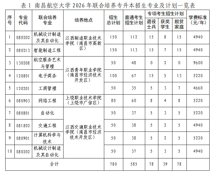 我校2026年联合培养专升本招生计划共计780人,具体情况详见表1。