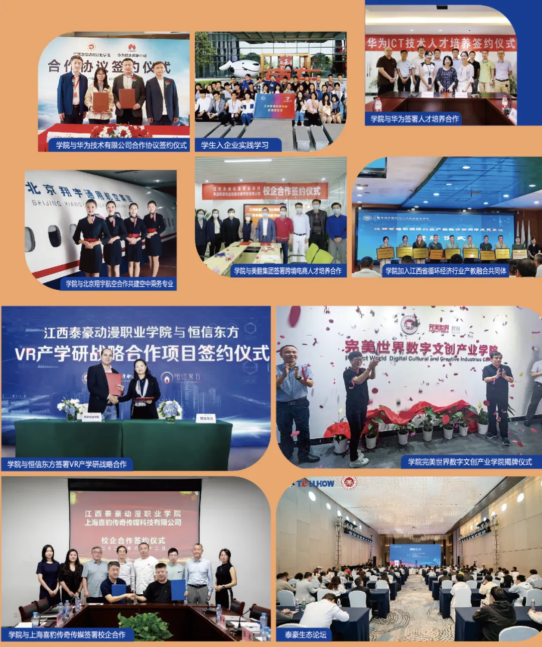 学院始终坚持“产教融合、校企合作”的发展理念,致力于深化“一技多能”人才培养模式的探索与实践,以“产业链现代化“1269”行动计划”为指导,坚持“以教促产、以产促教”的原则,积极组建产业学院、市域产教联合体、产教融合共同体,并推动产教融合项目的落地实施。学院先后与华为公司、完美世界教育、泰豪应急装备集团、美翻科技有限公司、江西华广电影视科技有限公司、中国联通等企业组建华为ICT产业学院、数字文创产业学院、智能制造产业学院、直播电商产业学院、华广数智影视制作产业学院、虚拟现实产业学院等产业学院;并与南昌高新技术产业开发区、南昌华勤电子科技有限公司、江西科技师范大学等单位共同牵头成立了南昌市光电产业产教联合体;作为主要参与单位,联合中国电信、华为公司、江西财经大学等单位,共同成立元宇宙行业、全国数字文化创意行业、网络软件安全行业、全国融媒体行业等行业产教融合共同体。