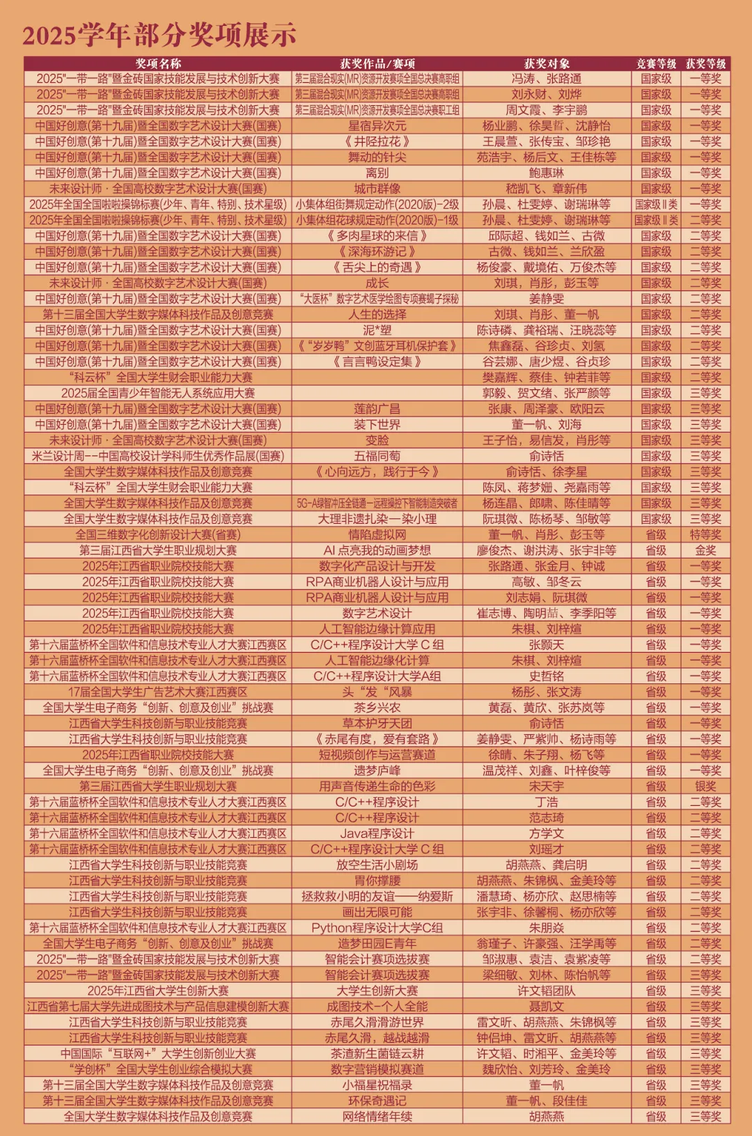经过历次发展升级,先后获批为国家文化产业示范基地、国家级众创空间、教育部现代学徒制人才培养单位、江西省人才培养模式创新试验区、江西省平安校园、省级大学科技园、省职业院校技能大赛突出贡献单位等,是江西省最早开始培养VR(虚拟现实)人才和首家招收外国留学生的高职院校。凭借近年来鲜明的办学特色和显著的办学成绩,荣获“办人民满意职业教育——江西职业教育十佳示范学校”,荣膺中央广播电视总台国际在线“2024年度产教融合标杆院系”。