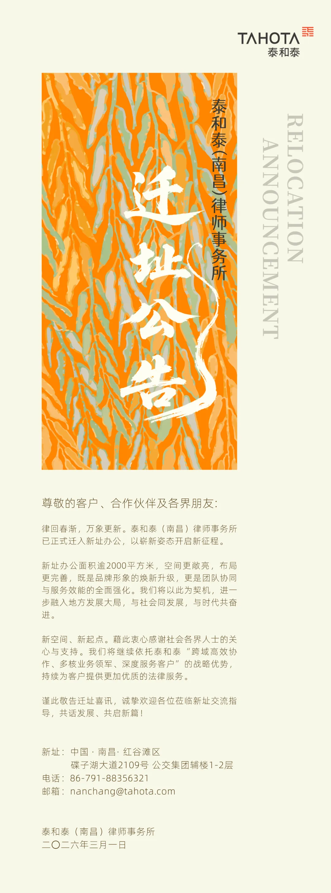 >泰和泰(南昌)律师事务所迁址公告