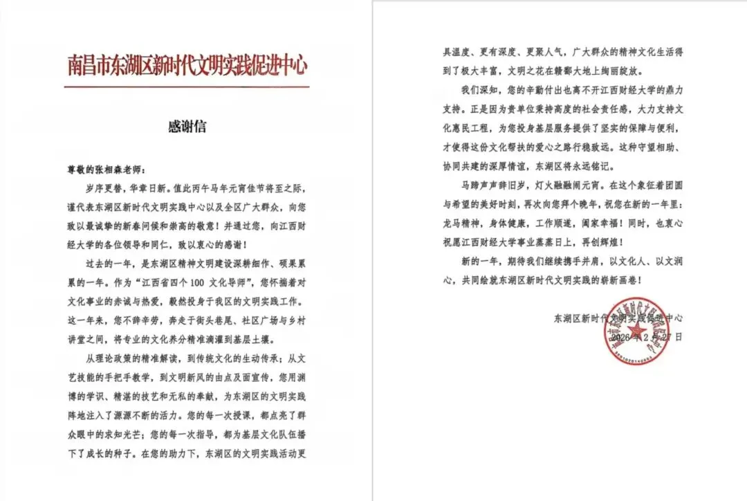 信中祝愿我校事业蒸蒸日上、再创辉煌,并期待与我校继续携手,以文化人、以文润心,共同绘就东湖区新时代文明实践崭新画卷。此次致谢,是对张相森老师践行社会责任的肯定,更是对我校服务地方发展、助力文化惠民工作的高度认可。