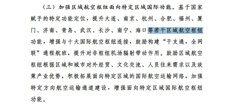 2026年2月26日,中国民用航空局发布《2025年全国枢纽机场分航线吞吐量》统计表,明确《指导意见》中未列明的沈阳等机场仍属于枢纽机场;并在《2025年全国民用运输机场生产统计公报》中进一步确认,区域航空枢纽范围继续参照《全国民用运输机场布局规划》(发改基础〔2017〕290号),即天津、石家庄、太原、呼和浩特、大连、沈阳、长春、杭州、厦门、南京、青岛、福州、济南、南昌、温州、宁波、合肥、南宁、桂林、海口、三亚、郑州、武汉、长沙、贵阳、拉萨、兰州、西宁、银川等29个区域航空枢纽。