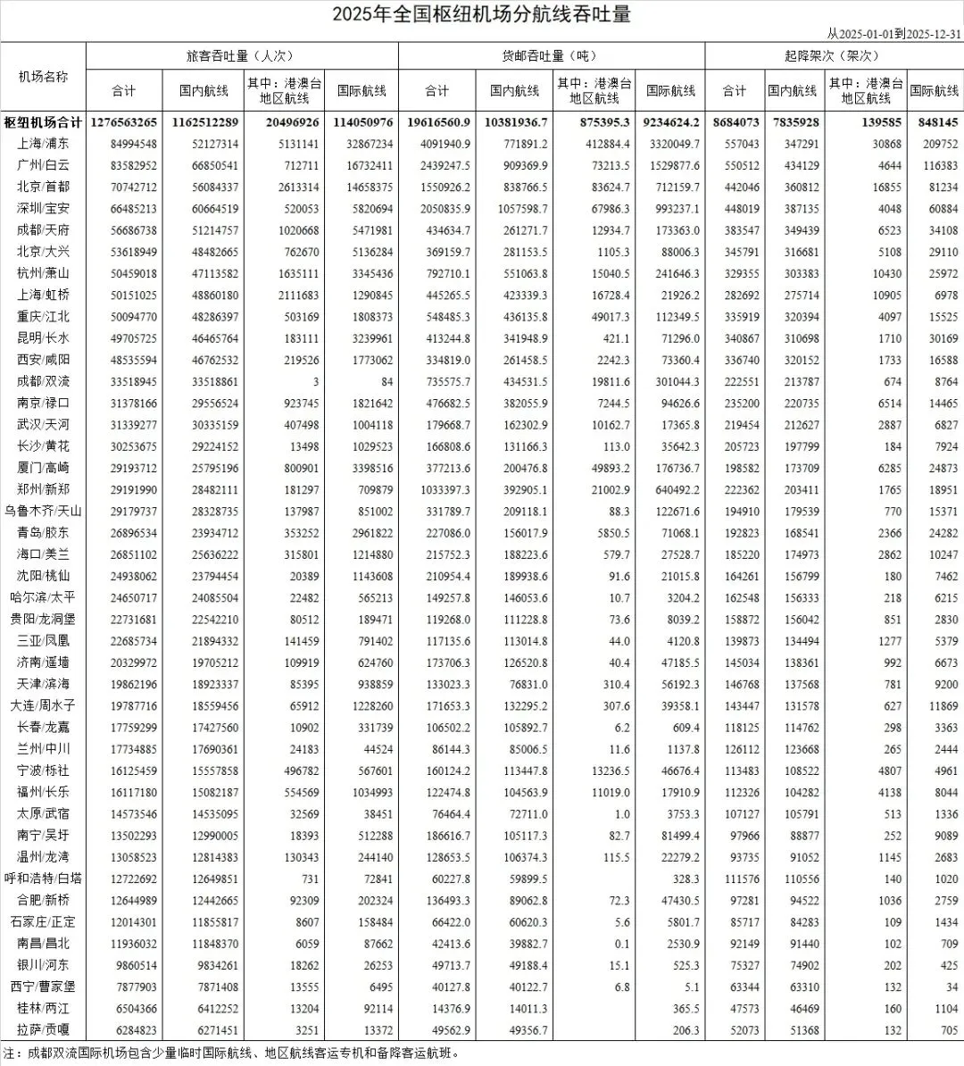 《2025年全国枢纽机场分航线吞吐量》(共计42座机场)