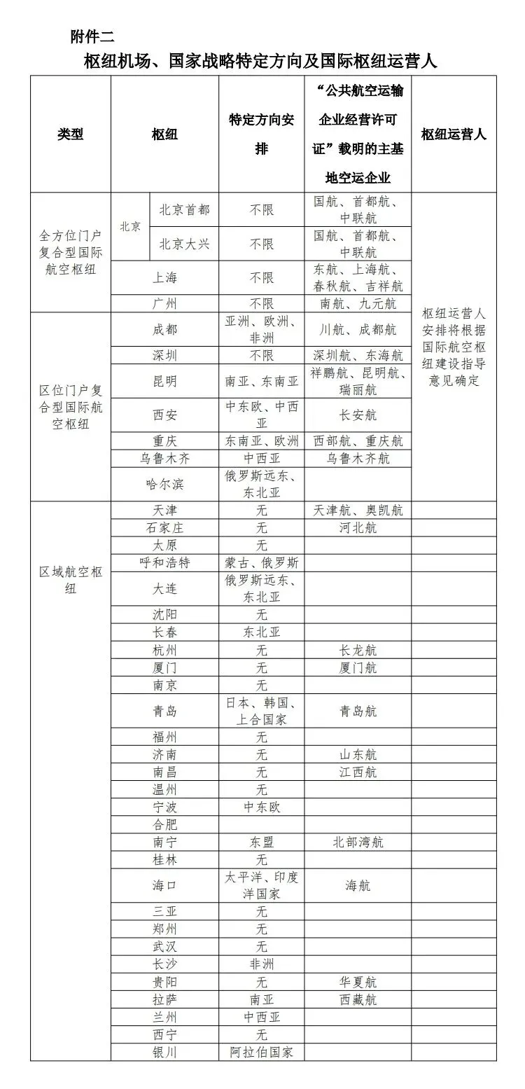 事实上,早在2024年7月《指导意见》印发后,社会各界就“3+7+N”未列明其余17个区域航空枢纽展开热议时,中国民用航空局已于2024年9月发布《国际客运航权市场准入和配置规则(征求意见稿)》,对相关枢纽机场作出特定方向航权安排,明确区域航空枢纽仍为29个,正式文件《国际客运航权市场准入和配置规则》(民航规〔2025〕2号)则于2025年3月30日生效实施。由此可见,自2017年《全国民用运输机场布局规划》以“10个国际航空枢纽+29个区域航空枢纽”取代2008年《关于加强国家公共航空运输体系建设的若干意见》中提出的“3个门户复合枢纽+8个区域枢纽+12个干线机场”布局体系以来,我国枢纽机场名单始终保持稳定。《指导意见》只是针对国际航空枢纽进一步细分为“3个全方位门户复合型国际航空枢纽+7个区位门户复合型国际航空枢纽”,而“N”所代表的区域航空枢纽数量与范围均未发生改变。
