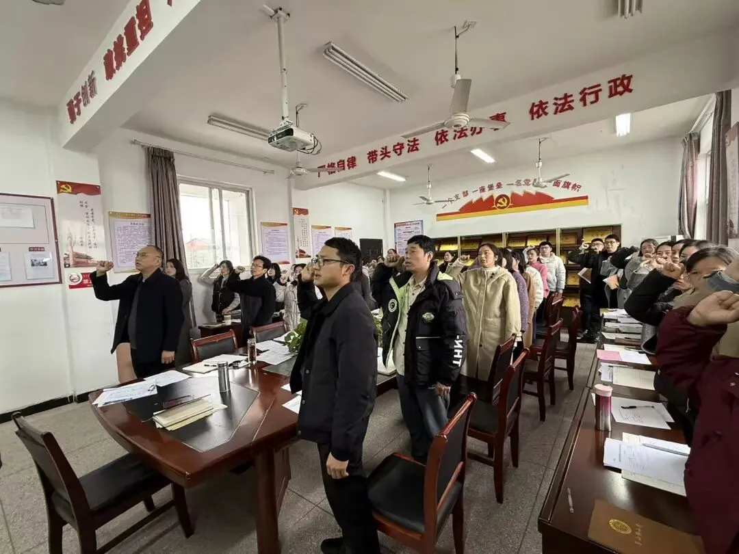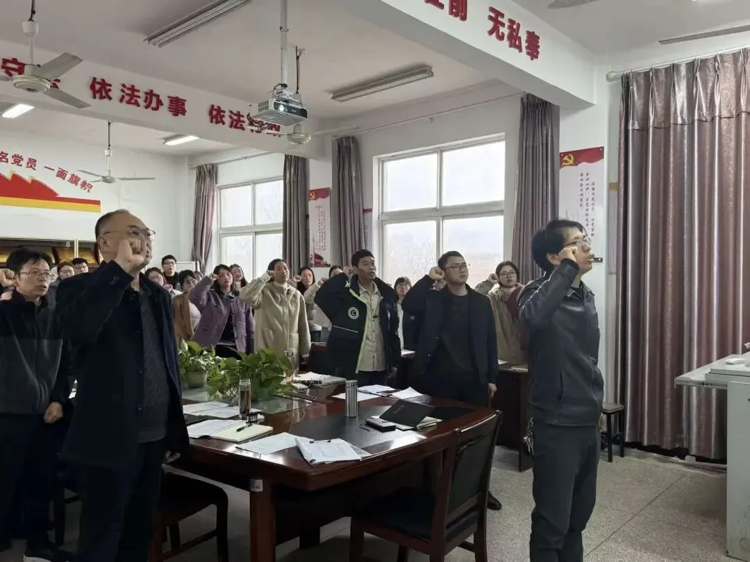在领誓人的带领下,全体教师高举右拳,面向国旗庄严宣誓。铿锵有力的誓言回荡在会场,字字句句饱含着对教育事业的赤诚热爱,彰显着恪守师德、潜心育人的坚定决心。这不仅是一次精神的洗礼,更是对“为党育人、为国育才”使命的郑重承诺。