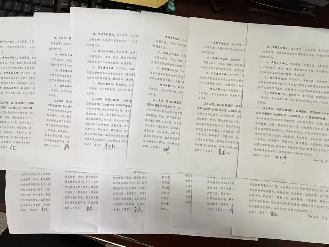 誓言入心,承诺于行。宣誓仪式后,全体教师依次接过《墨山街小学师德师风承诺书》,认真研读每一项条款,郑重签下自己的姓名。一笔一画,是对教育初心的坚守;字字千钧,是对职业底线的敬畏。