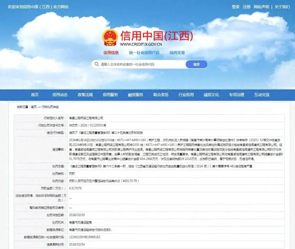 日前,信用中国(江西)公示了南昌公路桥梁工程有限公司的行政处罚决定。行政处罚决定书文号洪交罚﹝2026﹞01120001号显示,经查,南昌威洛阁建筑工程有限公司未取得公路养护作业资质。南昌公路桥梁工程有限公司将路网病害处置及其他附属设施项目分包给南昌威洛阁建筑工程有限公司的行为未取得建设单位及监理单位书面同意。当事人积极配合调查,工程已完成交工检测,符合质量要求。南昌公路桥梁工程有限公司与南昌威洛阁建筑工程有限公司结算合计金额651.7079万元,与南昌市公路事业发展中心结算合计金额 654.1966万元,涉及应缴纳税额19.1016万元,此税款已缴纳,属于亏损状态,无违法所得。