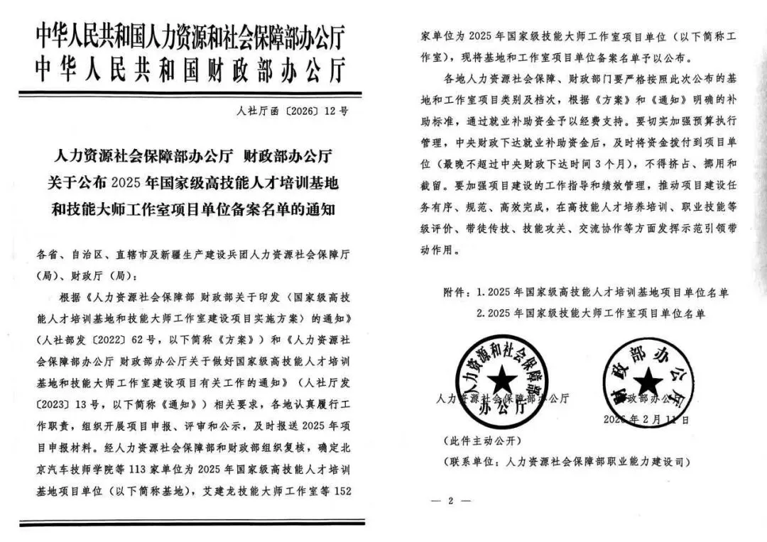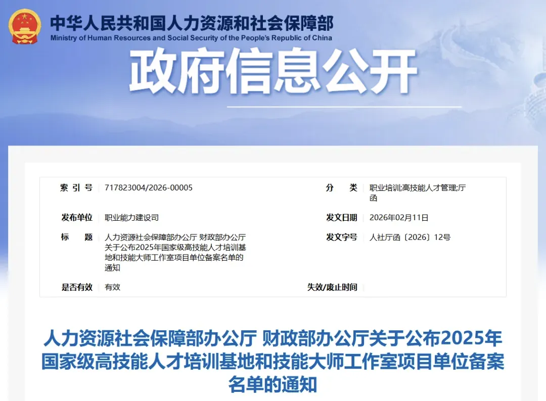 近日,国家人力资源社会保障部办公厅、财政部办公厅联合发布《关于公布 2025 年国家级高技能人才培训基地和技能大师工作室项目单位备案名单的通知》(人社厅函〔2026〕12号),南昌职业大学成功获批 2025 年国家级高技能人才培训基地项目单位A档!