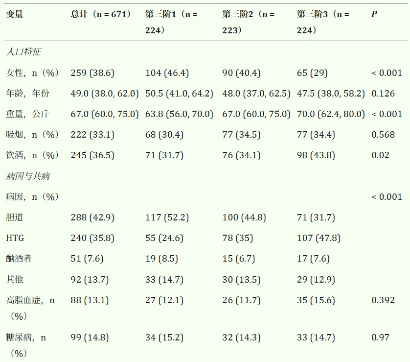 本研究共纳入671名完成7天IAP监测的SAP患者,进行累积暴露分析。其中,女性259人(38.6%)和男性412人(61.4%),中位年龄为50.2岁。在按CumIAP三元数分组受试者后,观察到其基线特征和临床结局有显著差异(见表1)。具体而言,与T1组相比,T3组的基线IAP、Cr、BUN、TG、APACHE II评分更高,目视率更高,手术或PCD干预率更高(均为P<0.05)。病因方面,胆道性胰腺炎在T1型中占主导(52.2%),而高甘油三酯血症诱发的胰腺炎在T3型中最为常见(47.8%,P率<0.001)。此外,概率密度曲线和直方图显示,CumIAP在临床结局(死亡、IPN和PMOF)方面比单日测量的IAP更具分辨力(见图)。2)。临床结局方面,T3组的LOS、ANC、IPN和PMOF显著升高(All P < 0.001)(见表2)。此外,Kaplan–Meier分析显示T3的死亡率显著更高(T1为39.3%,T1为11.2%,T2为19.3%;对数秩P < 0.05)(图。3)。