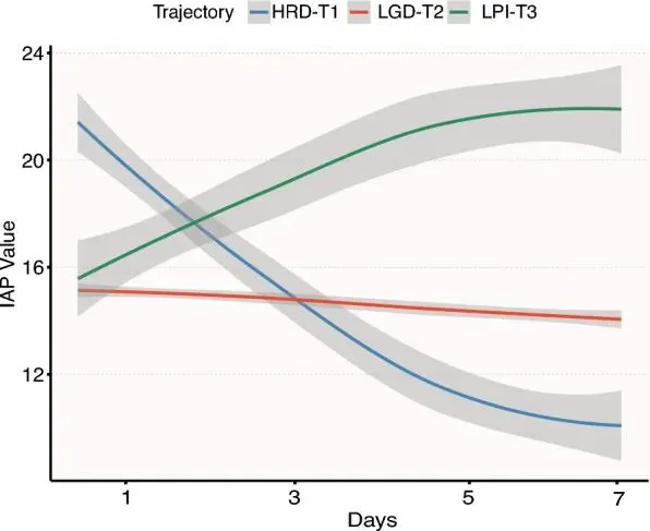 所有LCGMM均基于收敛度(系数=1)、最低贝叶斯信息准则、最高熵和后验概率(PP > 70%)进行评估。最优模型识别出三种不同的内购路径(见表S7);(1)高压快速下降组(HRD-T1,n = 56);(2)低压渐降组(LGD-T2,n = 909);(3)低压渐进增长群(LPI-T3,n = 43)(图。与LGD-T2相比,LPI-T3患者的Cr、BUN、APACHE II评分和干预措施均较高,HRD-T1的基线内心应用量最高(20 mmHg对LGD-T2为15,LPI-T3为15.5;P < 0.001)(表3)。HRD-T1和LPI-T3的IAP轨迹完全相反。
