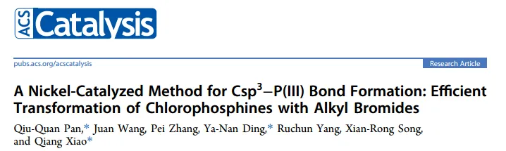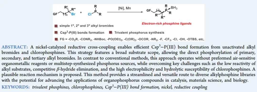 近日,南昌师范大学/肖强团队在《ACS催化》(ACS Catalysis)发表题为“A Nickel-Catalyzed Method for Csp3−P(III) Bond Formation: Efficient Transformation of Chlorophosphines with Alkyl Bromides”的研究,报道了一种镍催化还原交叉偶联构建 Csp³-P (III) 键的新方法,首次实现未活化烷基溴与易得氯膦的直接一步偶联,无需预制备有机金属试剂或多步合成磷源,显著提升了合成的原子和步骤经济性,该方法为高价值烷基膦化合物的合成提供了简洁、通用的新路线,有望推动有机磷化学在催化、生物医药和材料领域的进一步发展。镍催化还原交叉偶联反应实现了未活化烷基溴与氯膦的高效 Csp³-P (III) 键构建。该策略具有广泛的底物适用范围,可实现伯、仲、叔烷基溴的直接磷化。与传统方法相比,该方法无需使用预制备的对空气敏感的有机金属试剂或多步合成的磷源,同时克服了烷基底物反应活性低、竞争性 β- 氢消除以及氯膦亲电性强、易水解等关键难题。本文提出了合理的反应机理,为构建多样化的烷基膦化合物库提供了一条简洁、通用的路线,有望推动有机磷化合物在催化、材料科学和生物学领域的应用。三价膦是有机磷化学的核心,其可调控的电子性质和配位能力使其成为均相催化中的优势配体,能提升工业过程的选择性和效率。富电子烷基取代的三价膦衍生物因强给电子性和大空间位阻,在惰性键活化和选择性转化中表现优异,但这类膦的合成存在重大挑战。