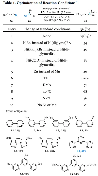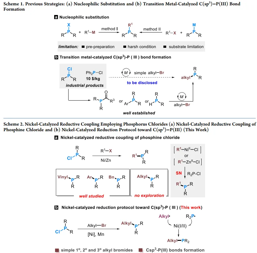 传统合成策略主要基于亲核取代反应,存在严格的无水 / 无氧要求、需化学计量金属试剂、底物对空气 / 水分敏感等局限性,限制了官能团耐受性和底物范围。过渡金属催化为 C (sp³)-P (III) 键构建提供了温和、官能团耐受性好的方法,但现有方法的磷源仍需从氯膦前体制备,直接将易得的氯膦与未活化烷基溴偶联的方法尚未被探索,开发一步偶联策略具有重要的原子和步骤经济性。