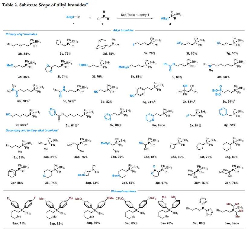 - 方法创新首次实现未活化烷基溴与易得氯膦的直接一步偶联,无需预制备有机金属试剂或多步合成磷源,显著提升了合成的原子和步骤经济性。