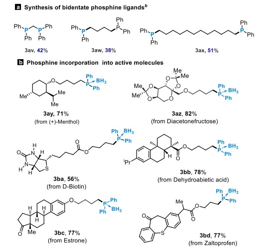 - 应用价值不仅能合成双齿膦配体,还可实现膦基向 D - 生物素、雌酮、扎托洛芬等生物活性分子的后期官能团化,收率 56%-82%,在催化配体设计、药物合成、材料科学中具有重要应用前景。