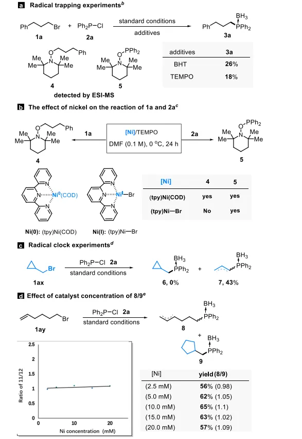 4. 机理研究- 自由基捕获实验:加入 BHT、TEMPO 等自由基清除剂会显著抑制产物生成,TEMPO 可捕获烷基自由基和二苯基膦基自由基,证实反应为自由基机理;Ni (0) 可介导烷基溴产生烷基自由基,Ni (0) 和 Ni (I) 均可活化氯膦生成膦基自由基。