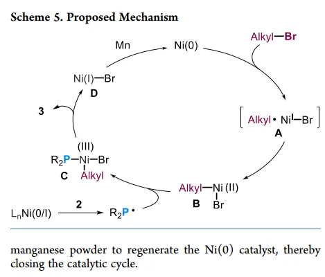 - 反应机理为自由基接力机理,Ni (0) 活化烷基溴生成烷基自由基,Ni (0)/Ni (I) 活化氯膦生成磷自由基,二者通过镍中间体偶联,最终经还原消除得到产物,Mn 粉作为还原剂实现镍催化剂的循环。
