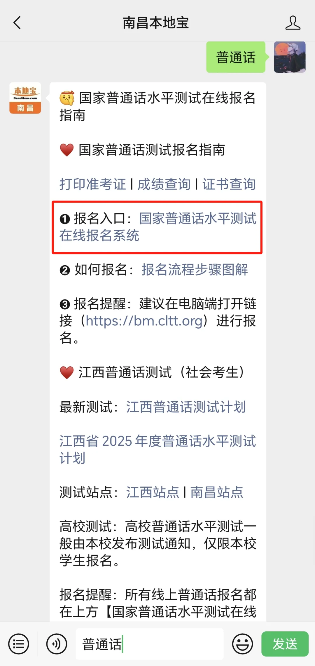 南昌本地宝推出非常多的功能,进入【南昌本地宝】公众号聊天对话框里,点击发消息,在对话框内输入并发送对应的【关键词】即可获取相关内容。