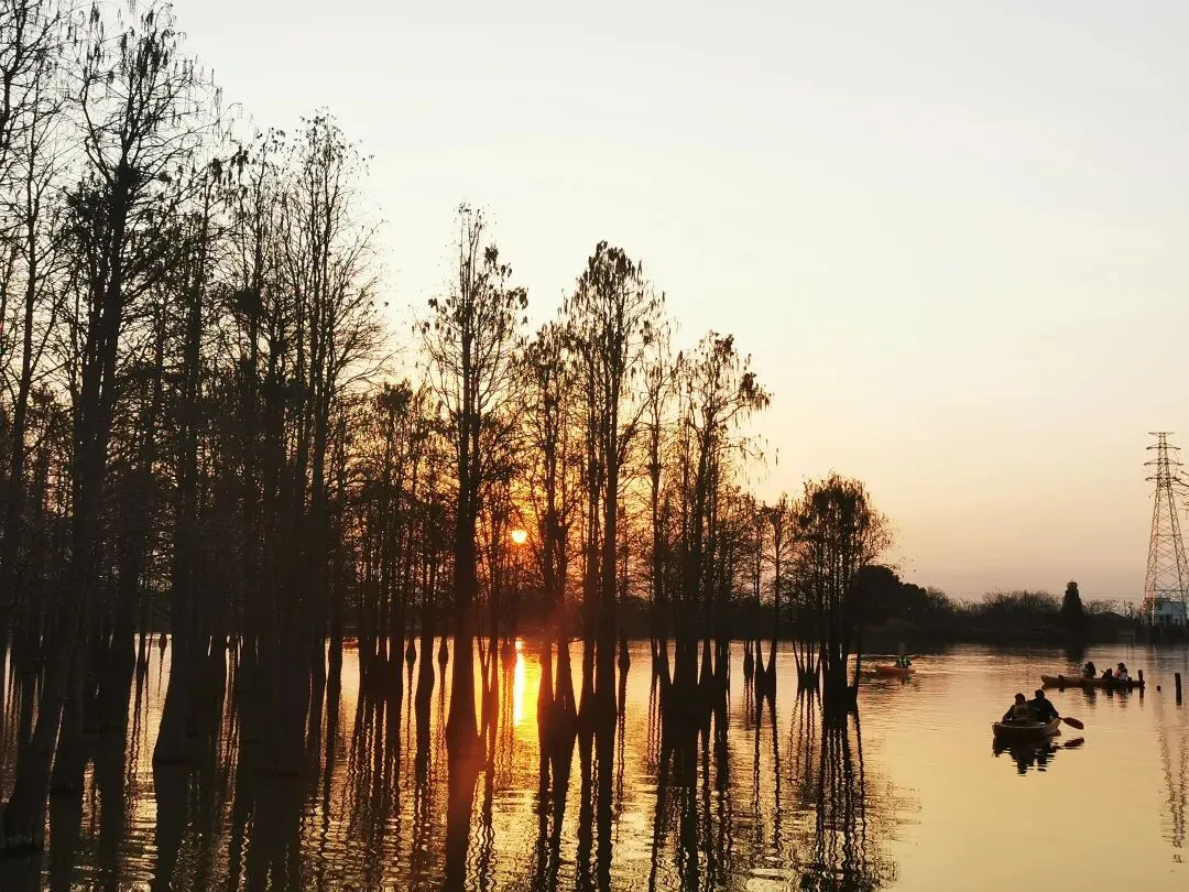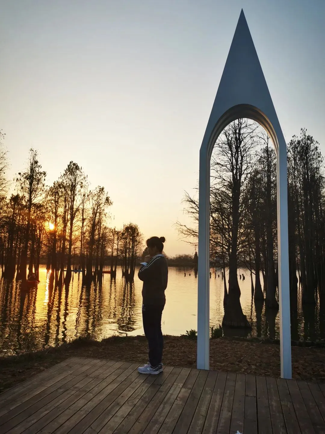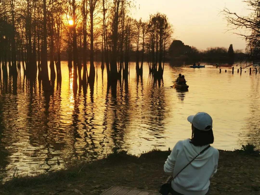 虽然水杉的叶子已落了大半,枝干显得清瘦挺拔,但正因为如此,阳光才能毫无遮挡地洒下来。光线穿过疏朗的枝桠,在微微荡漾的水面上碎成万点金光,柔和地映在脸上。