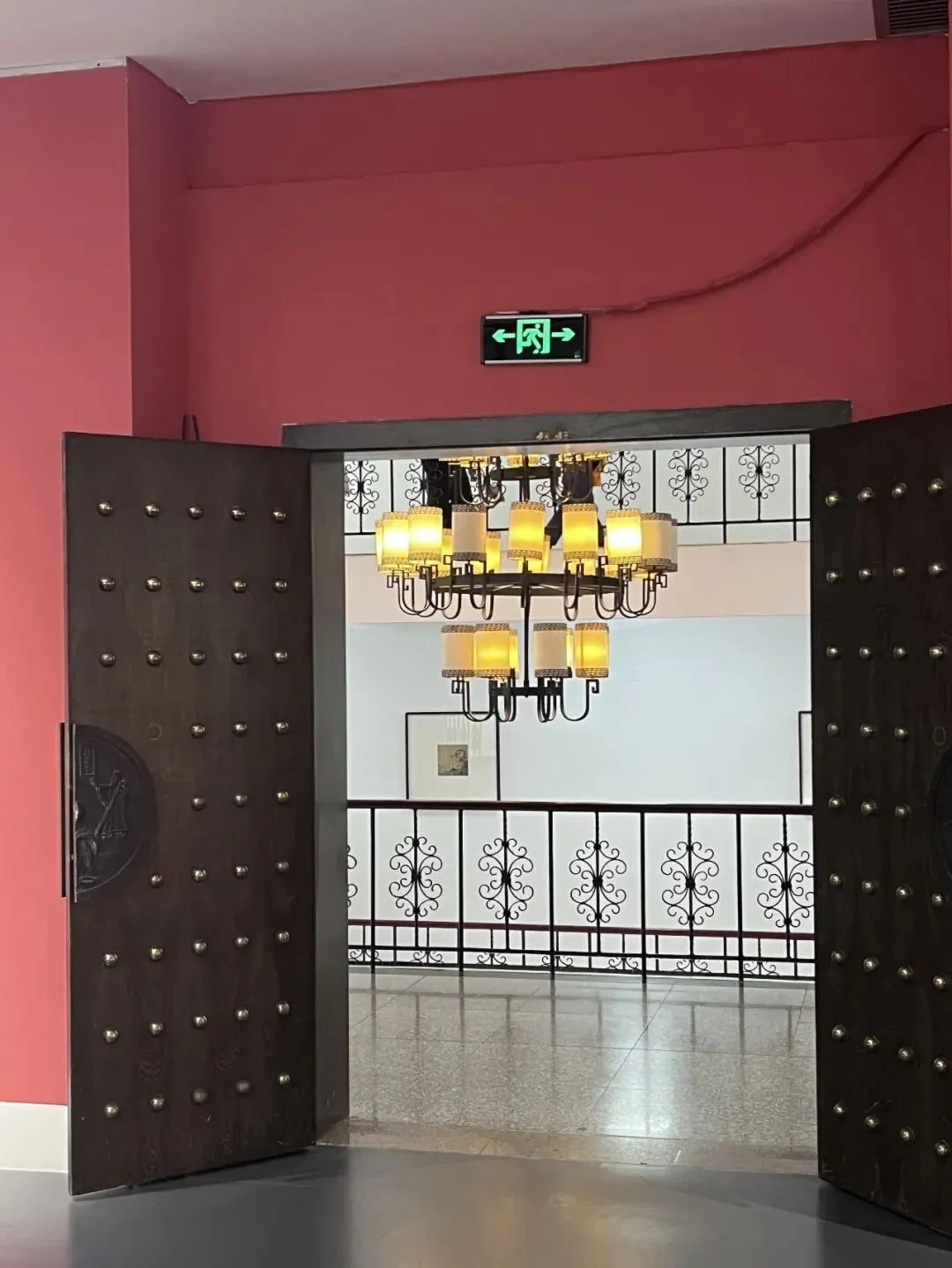 从展厅内部往门外看,红墙黑门,和金色的灯光,这个色系搭起来还真是好看