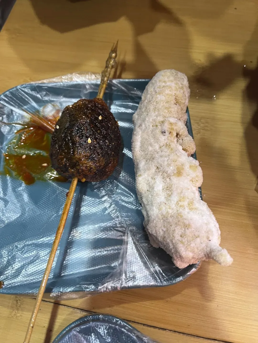 这个是尝鲜点的炸香蕉、炸皮蛋。香蕉是选的青皮的香蕉,炸完之后裹粉,外脆里软,甜甜的。皮蛋外面炸了个酥皮,也还不错