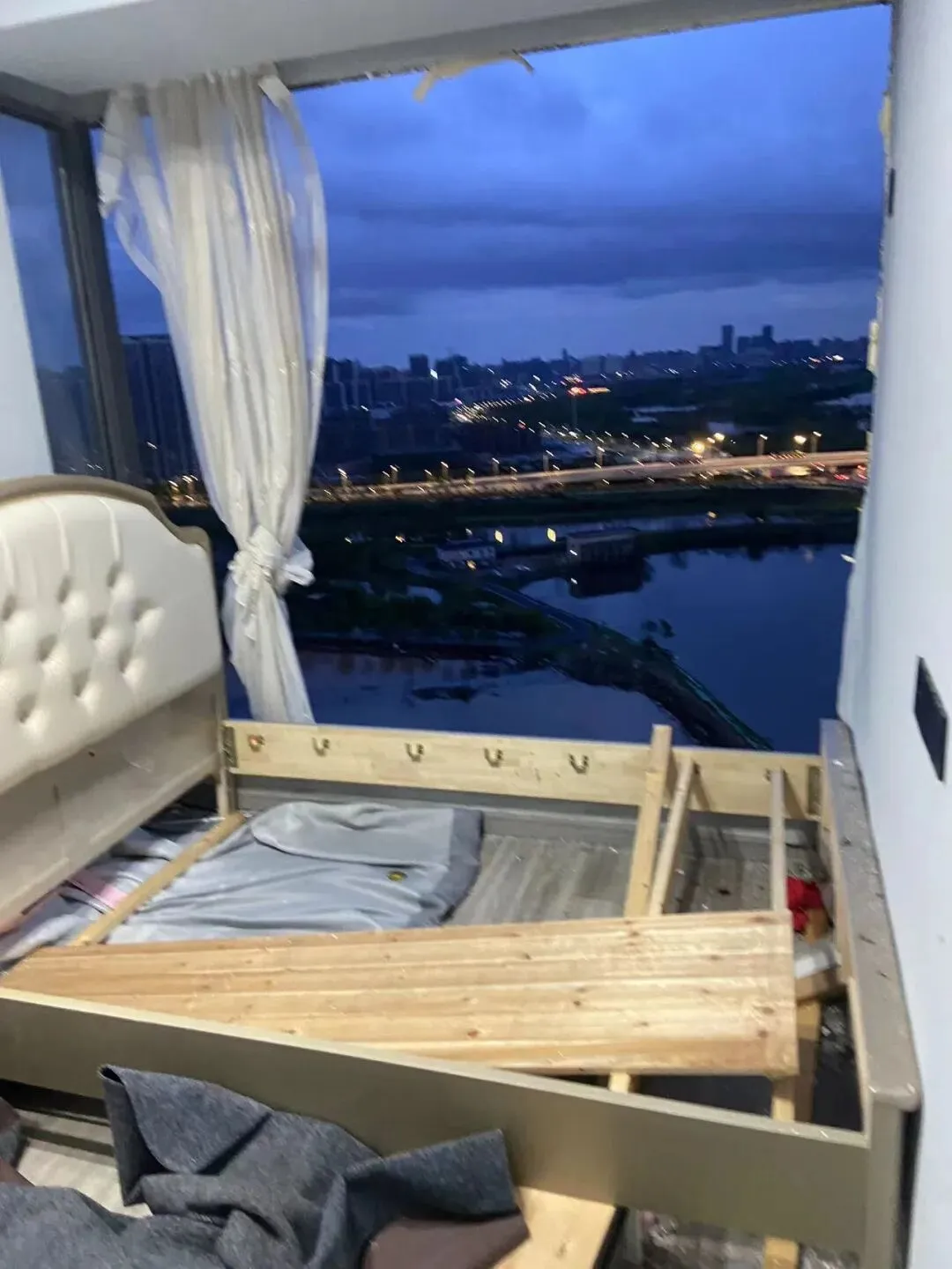 强风过后,张黎家次卧的床垫被吹走,床架也损坏严重。受访者供图作者 | 杜佳冰 李铃澜