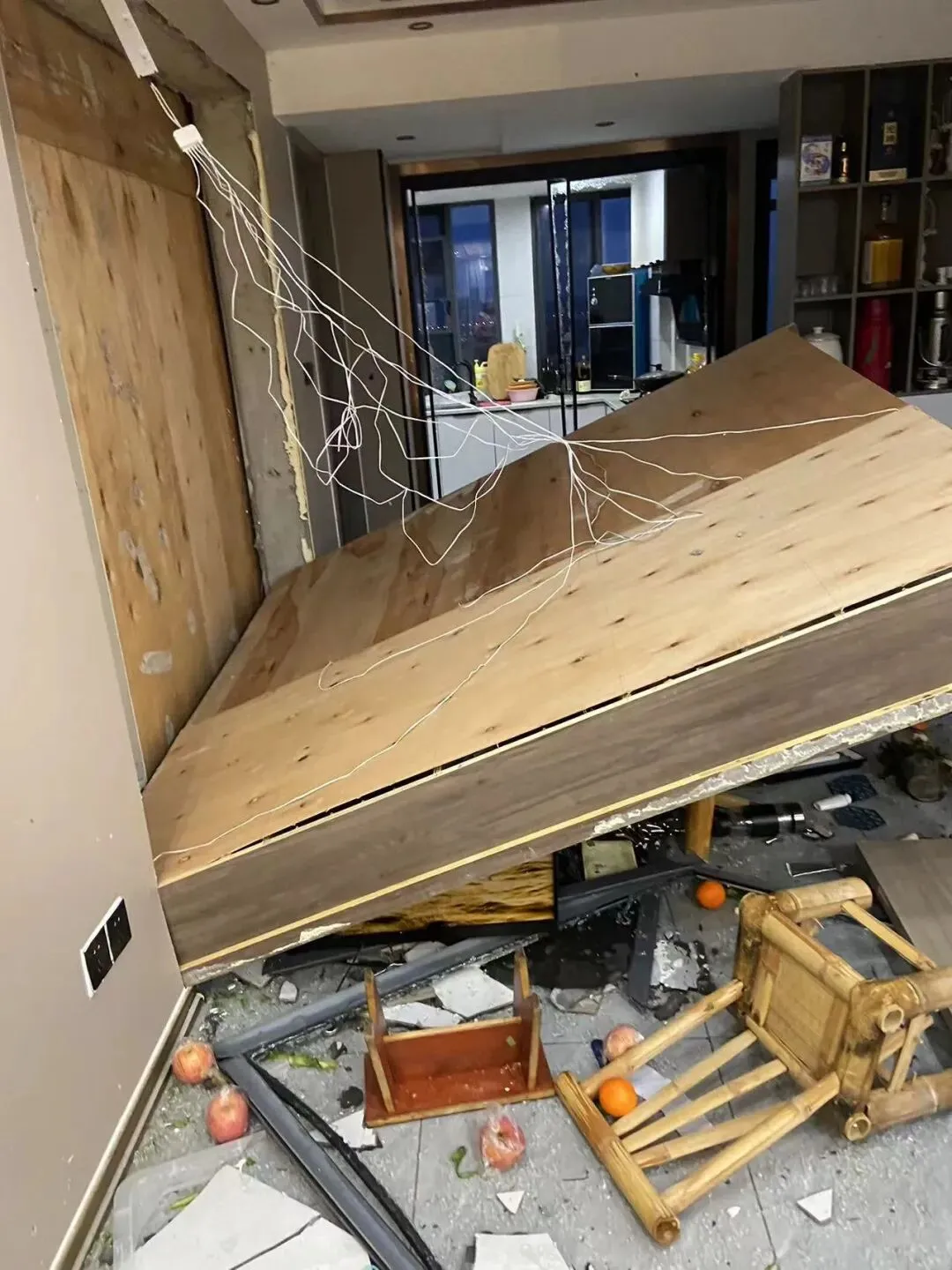 2时58分左右,她被风雨惊醒时,睡在次卧的儿子和婆婆已经不见了。整扇窗户连着窗框、天花板、床垫、床头柜,一起消失了。卧室破了一个大洞,风呼呼往里灌。