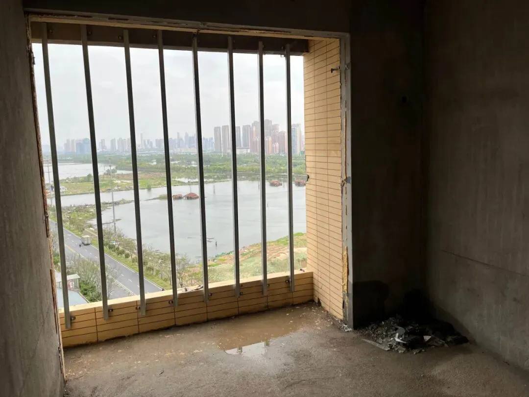 毛坯状态的客厅阳台约4米宽,有一面约1米高的玻璃围栏。在阳台与客厅的衔接处,有一扇玻璃推拉门,已经被狂风吹倒。