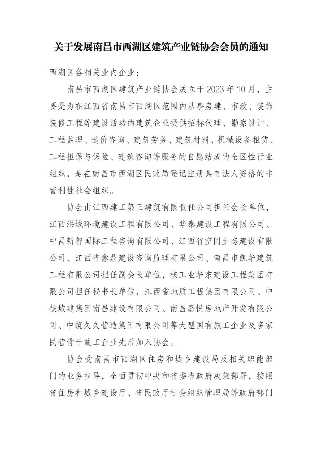 南昌市西湖区建筑产业链协会成立于2023年10月,主要是为在江西省南昌市西湖区范围内从事房建、市政、装饰装修工程等建设活动的建筑企业提供招标代理、勘察设计、工程监理、造价咨询、建筑劳务、建筑材料、机械设备租赁、工程担保与保险、建筑咨询等服务的自愿结成的全区性行业组织,是在南昌市西湖区民政局登记注册具有法人资格的非营利性社会组织。