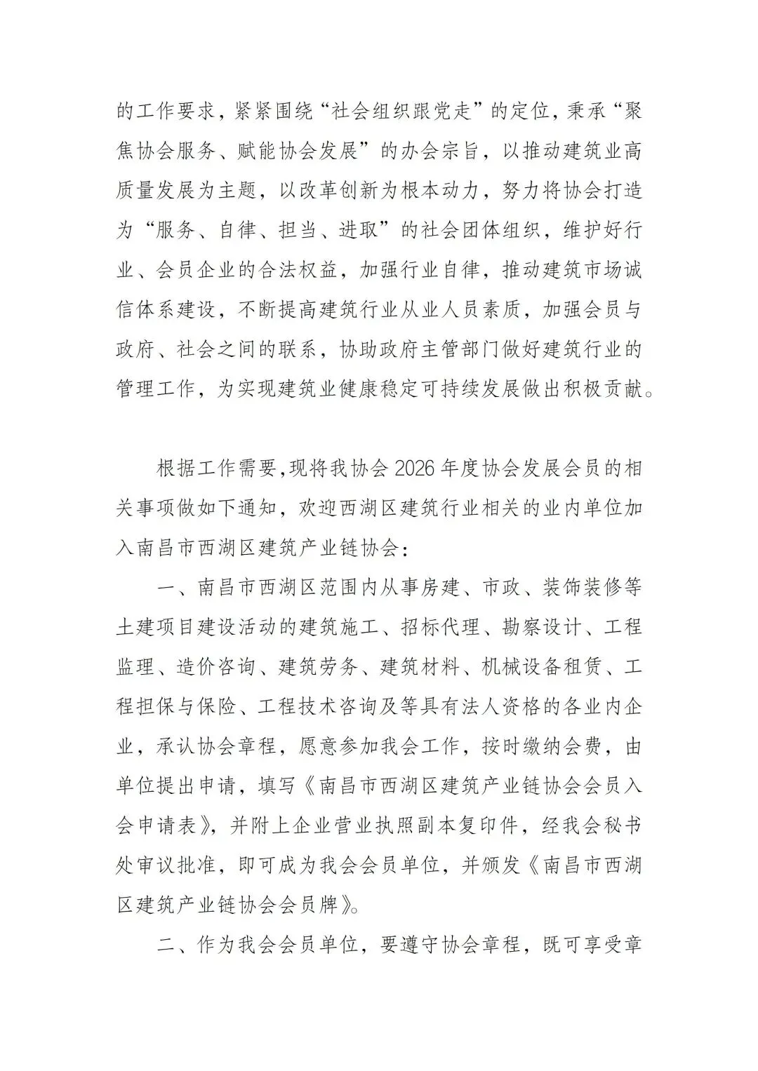 协会受南昌市西湖区住房和城乡建设局及相关职能部门的业务指导,全面贯彻中央和省委省政府决策部署,按照省住房和城乡建设厅、省民政厅社会组织管理局等政府部门的工作要求,紧紧围绕“社会组织跟党走”的定位,秉承“聚焦协会服务、赋能协会发展”的办会宗旨,以推动建筑业高质量发展为主题,以改革创新为根本动力,努力将协会打造为“服务、自律、担当、进取”的社会团体组织,维护好行业、会员企业的合法权益,加强行业自律,推动建筑市场诚信体系建设,不断提高建筑行业从业人员素质,加强会员与政府、社会之间的联系,协助政府主管部门做好建筑行业的管理工作,为实现建筑业健康稳定可持续发展做出积极贡献。