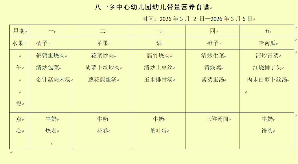 我们每一餐都秉持幼儿膳食“全面、均衡、营养”的原则,根据季节挑选当季时令瓜果蔬菜、新鲜水果、蔬菜、肉蛋奶、谷物等,这些食物富含丰富的膳食纤维,进行科学配比,制定每周营养食谱,每周更新。
