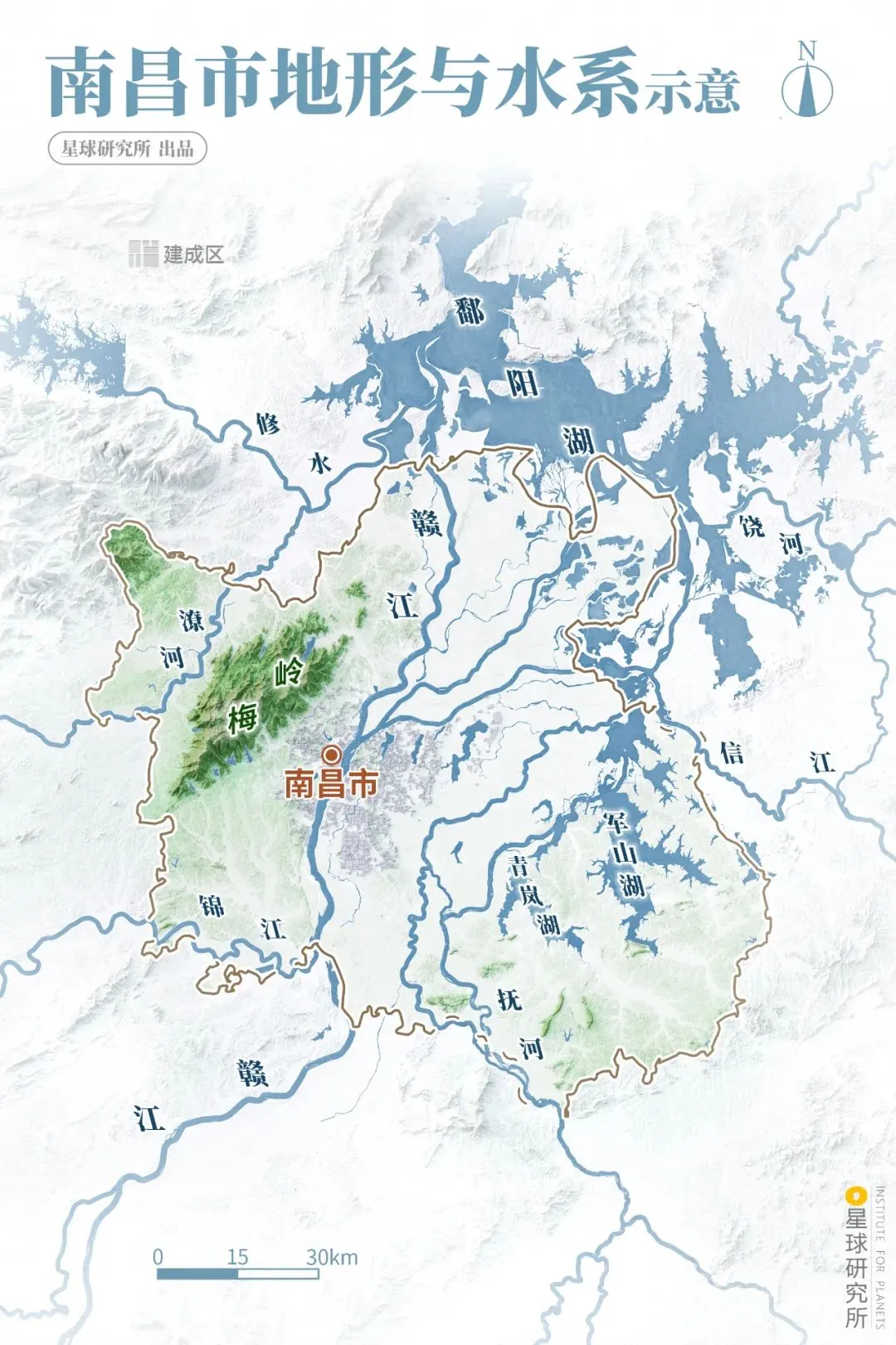 (南昌地形与水系示意,制图@俊/星球研究所)