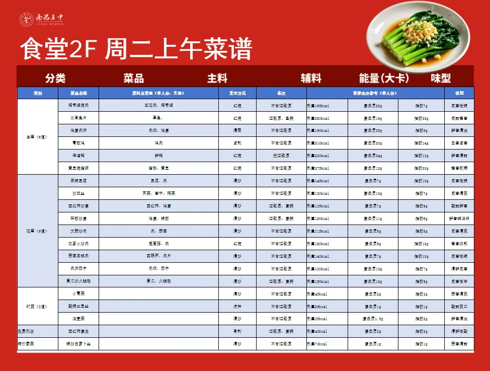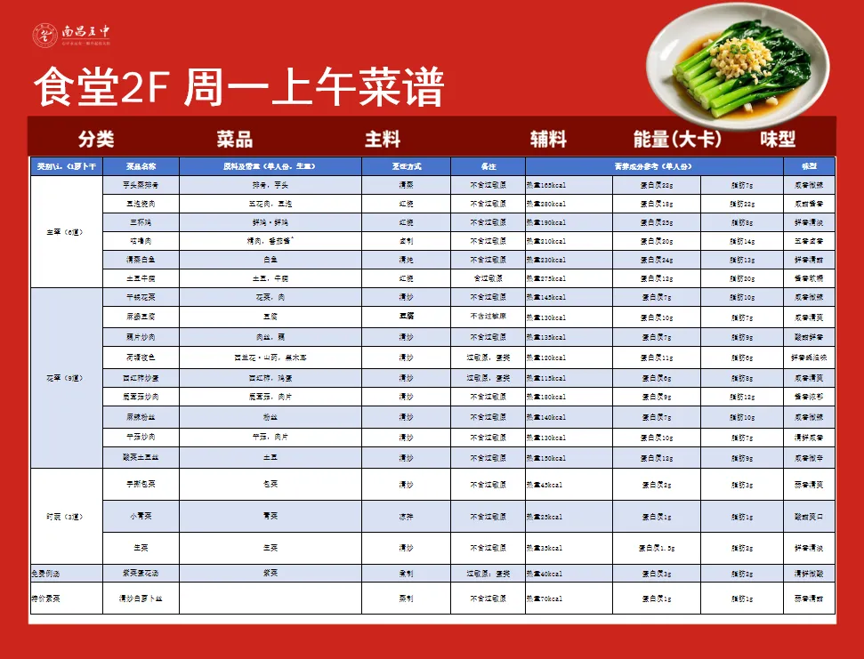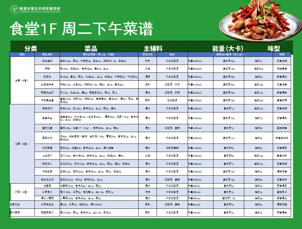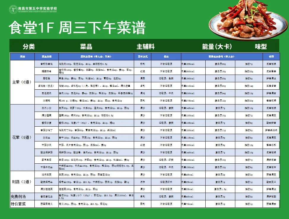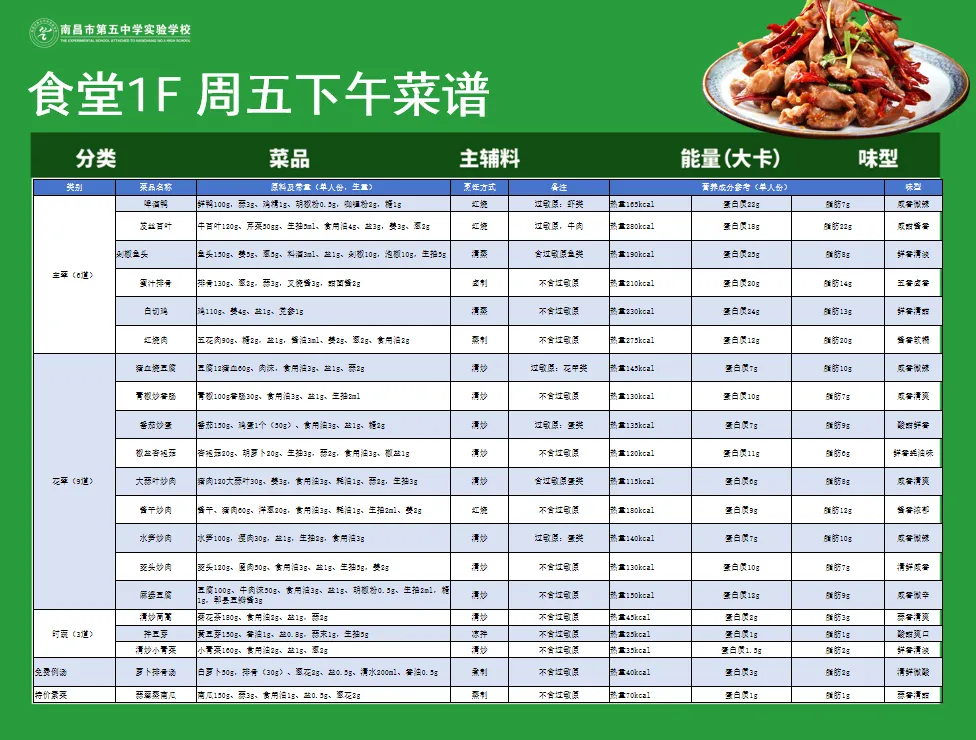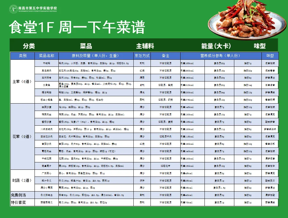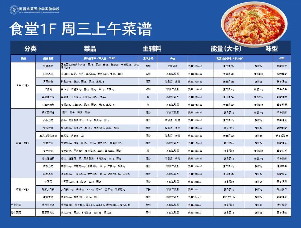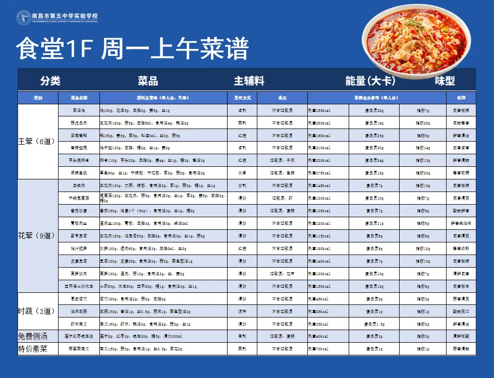 健康的饮食是学生成长的根基,日常的营养膳食是保证学生身心成长的关键基础。为提升师生膳食质量,守护师生“舌尖上的安全”,南昌五中后勤部门精心设计了兼顾营养与风味的美食菜单,多措并举,全方位保障师生享用的餐食安全、营养、美味。
