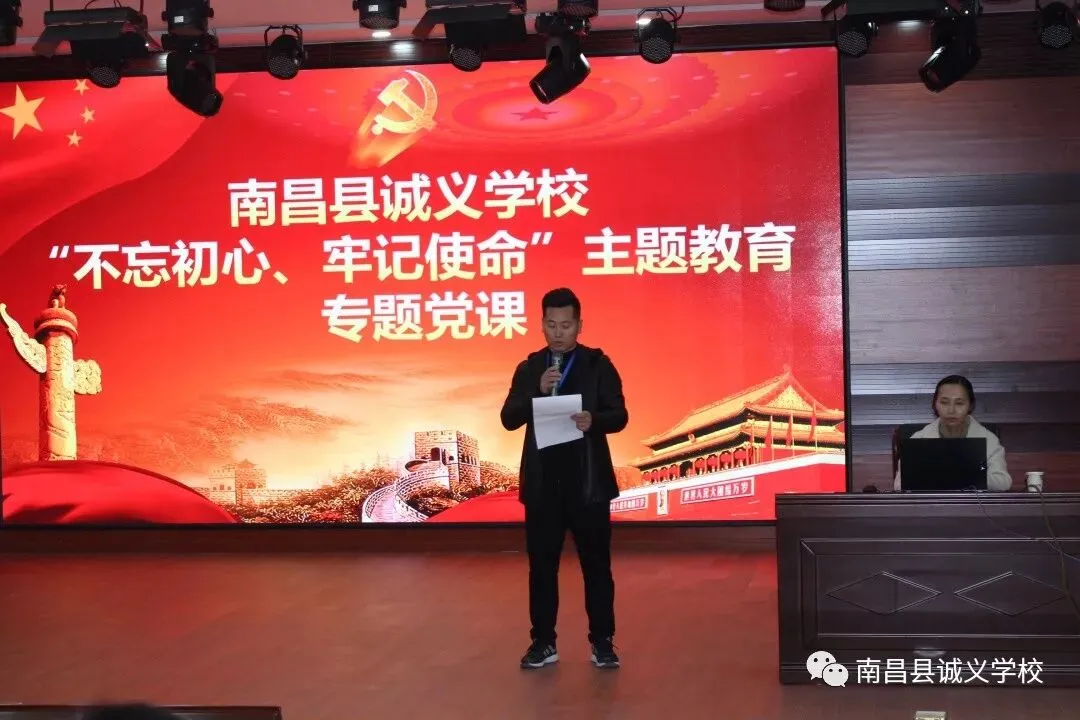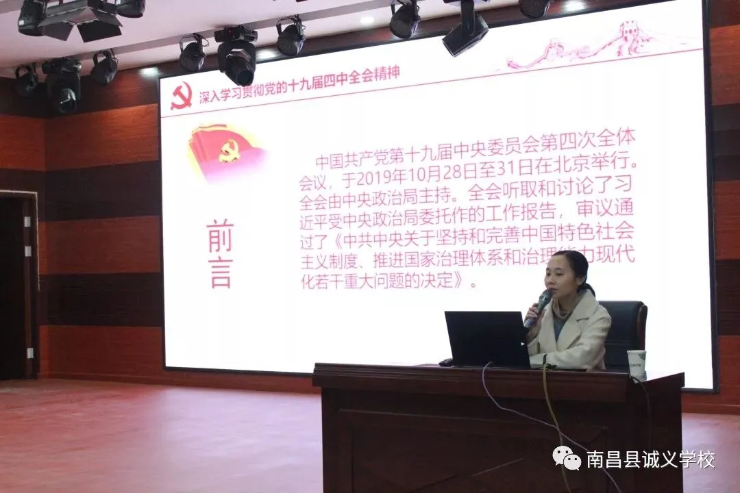 为扎实开展“不忘初心、牢记使命”主题教育。提升诚义学校教师政治理论水平。12月11日,南昌县诚义学校开展了“不忘初心、 牢记使命”主题教育专题党课活动,南昌县委党校校团委副书记邬璐佳带领全体诚义教师深入学习贯彻党的十九届四中全会精神。