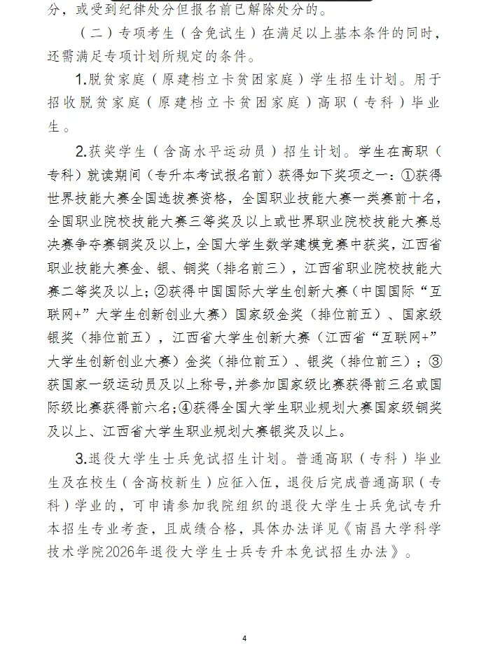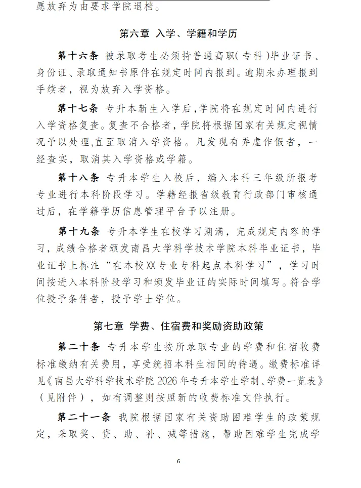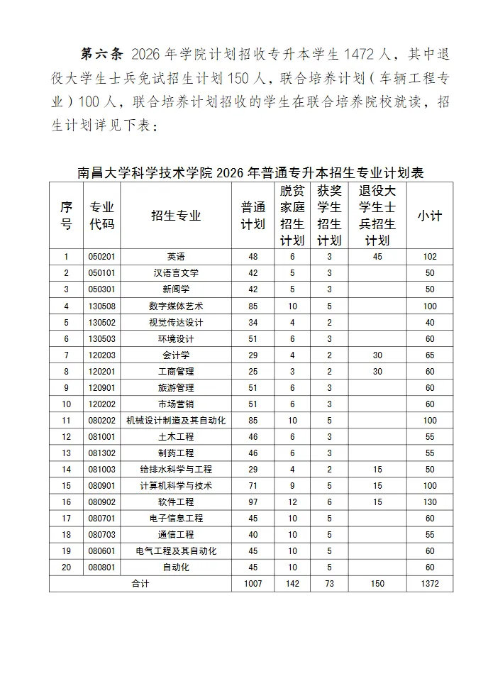 【共招1472人】南昌大学科学技术学院2026年专升本招生章程