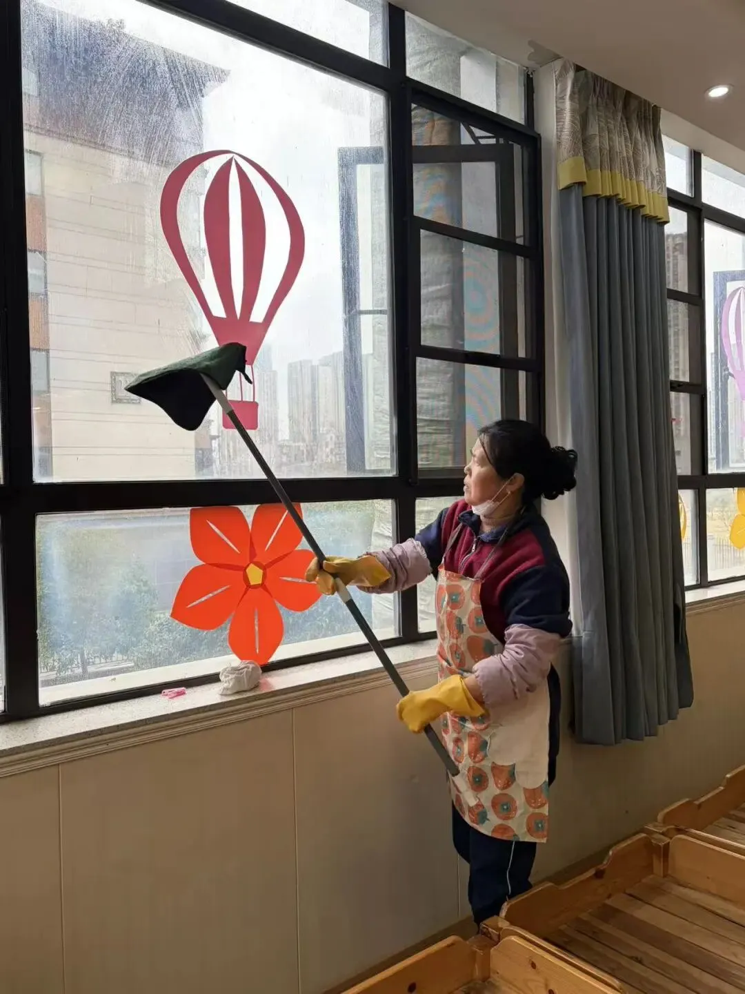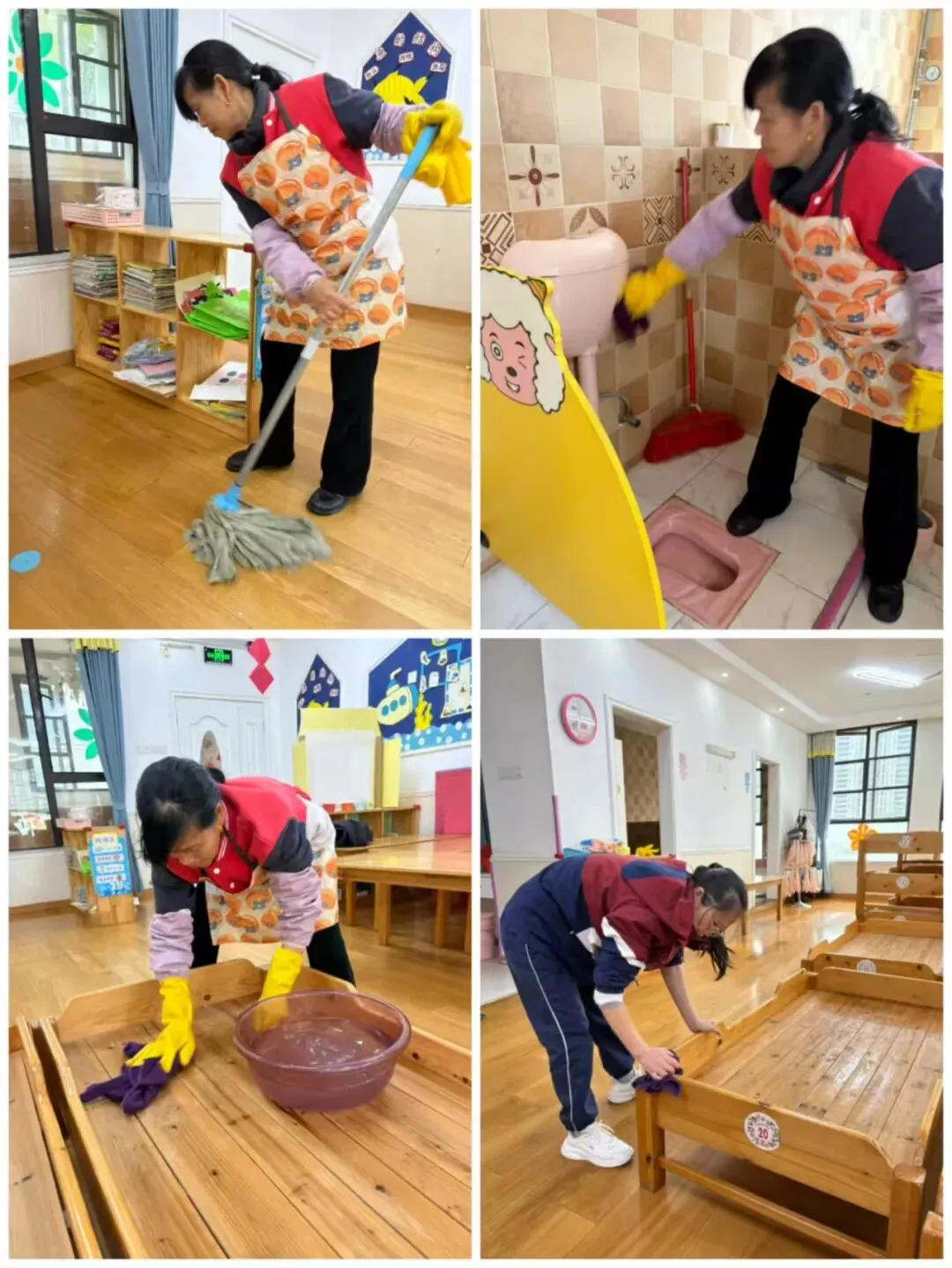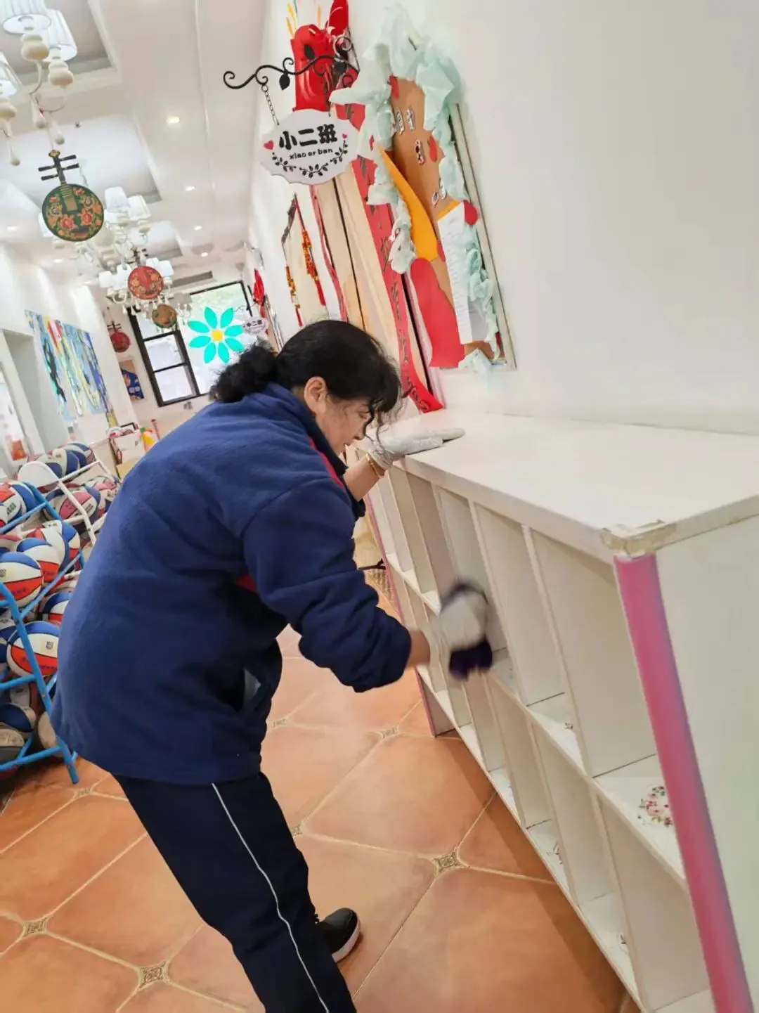 一言一行显用心,一隅一物皆温情。为给孩子们打造安全、洁净、温馨、舒适的成长空间,全体教职工对全园环境开展无死角清洁消毒,重点对教室、户外活动区、食堂等关键区域进行深度清扫,玩具、桌椅、餐具等物品逐一规范消杀,全力守护幼儿健康。