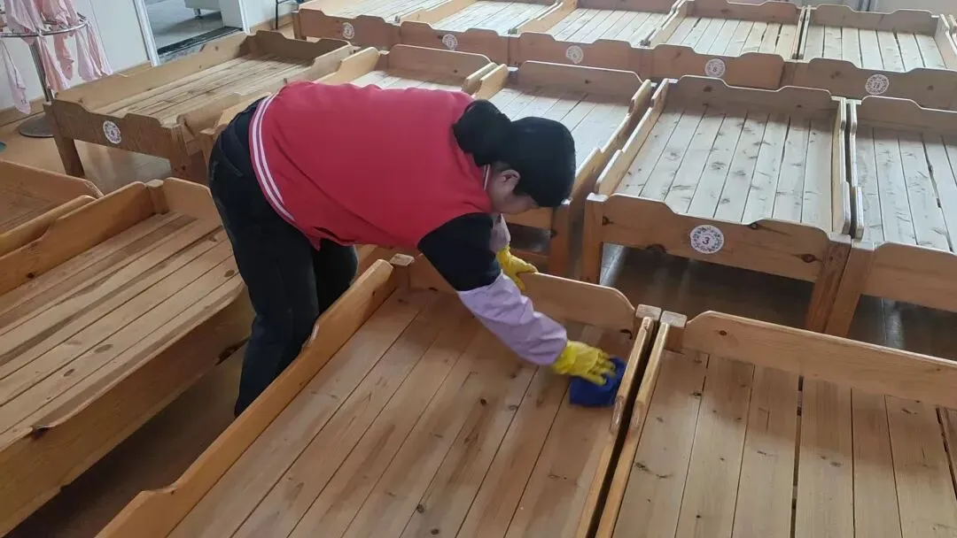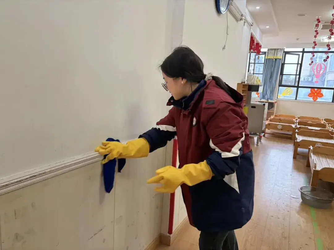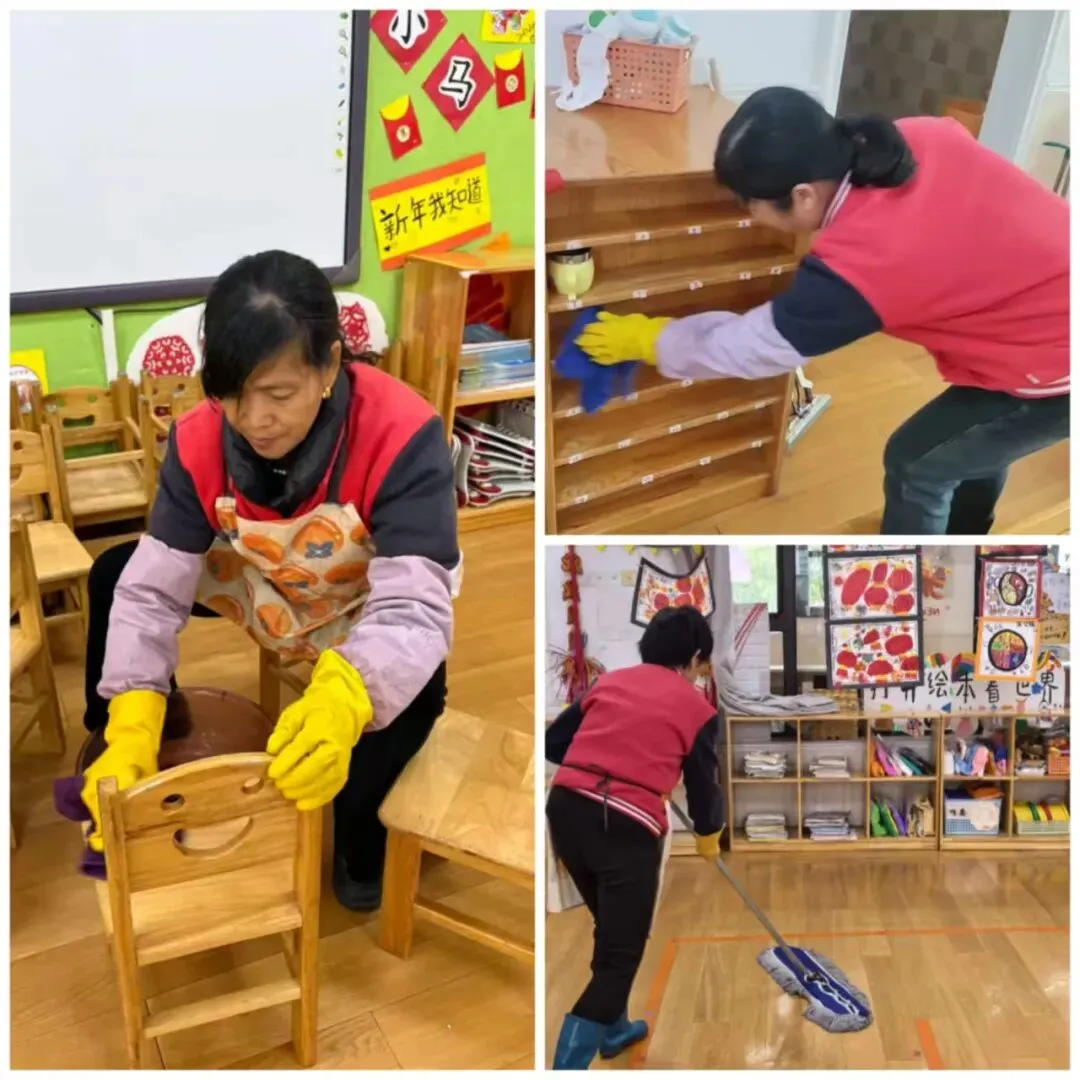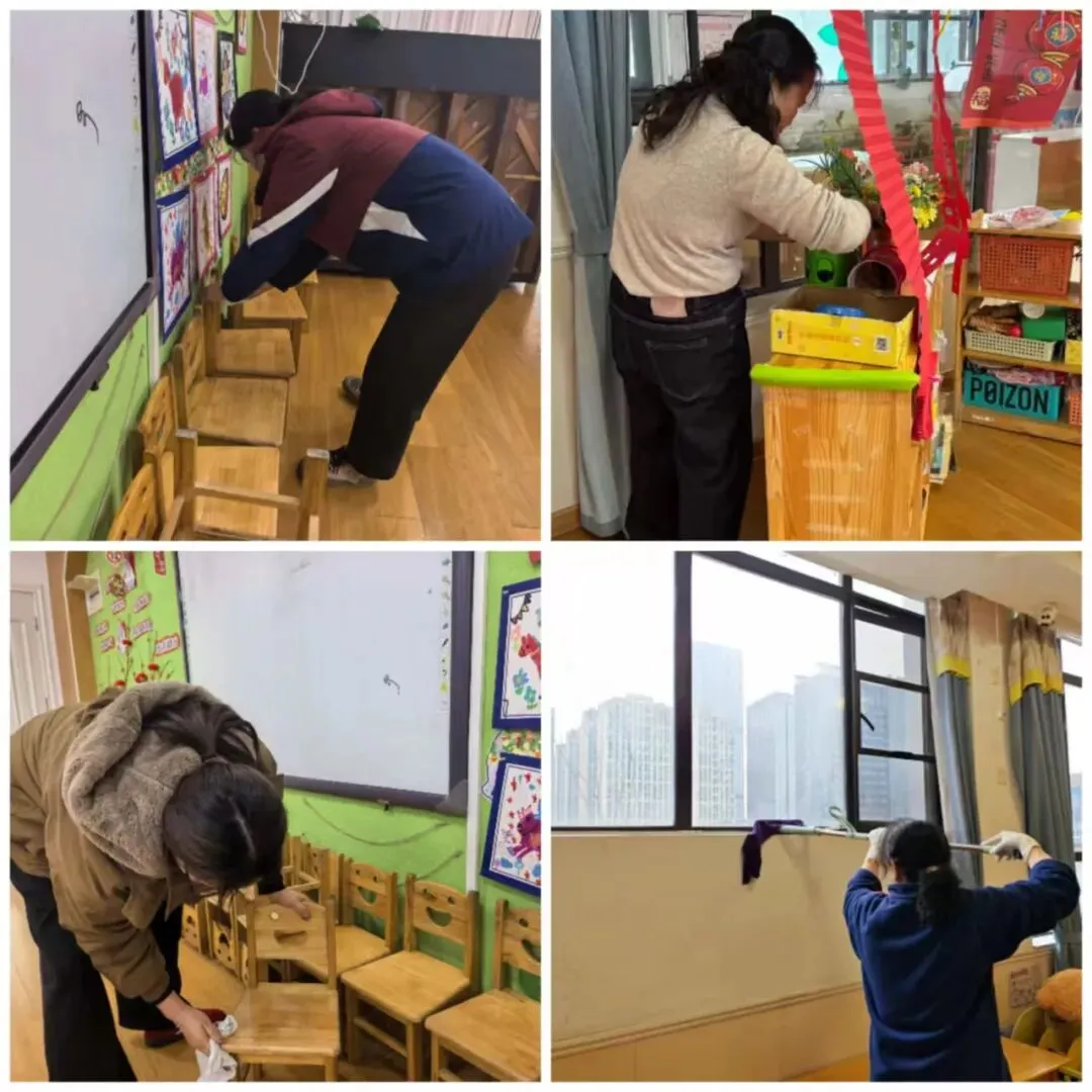 一言一行显用心,一隅一物皆温情。为给孩子们打造安全、洁净、温馨、舒适的成长空间,全体教职工对全园环境开展无死角清洁消毒,重点对教室、户外活动区、食堂等关键区域进行深度清扫,玩具、桌椅、餐具等物品逐一规范消杀,全力守护幼儿健康。