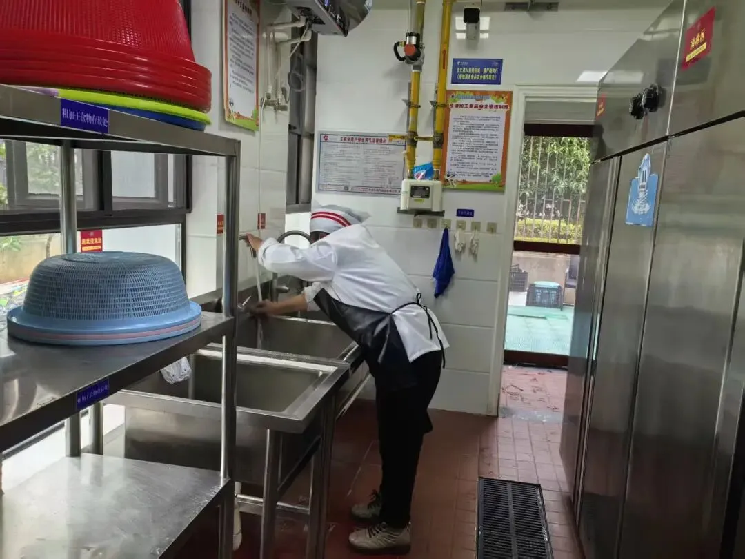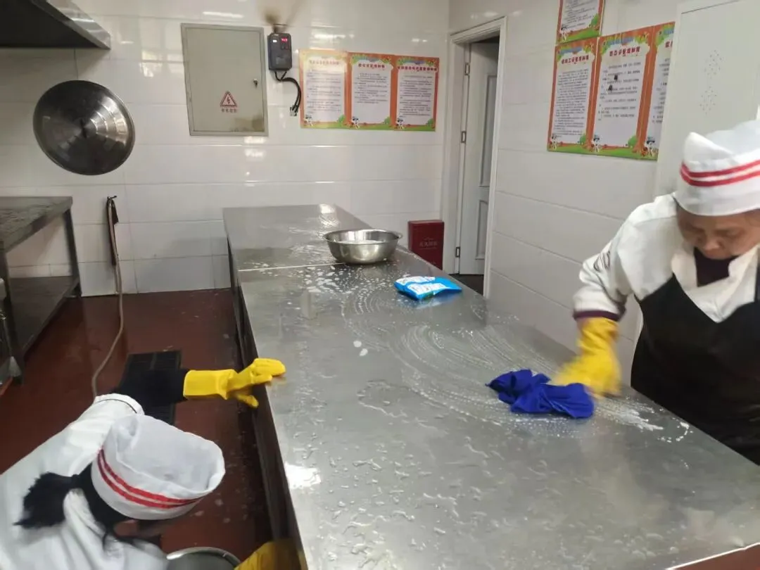 食堂工作人员严格遵照食品卫生标准,对厨房设备、餐具、操作区域进行全面清洁整理,严守食品安全防线,保障幼儿饮食健康安全。