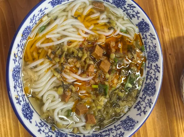特别要说说牛骨粉。这是当地人的早起动力。大块的牛骨熬汤,粉是粗的那种,很有嚼劲。吃的时候,别顾形象,端起骨头吸里面的骨髓,那股子脂香混着汤底的辛辣,“滋溜”一下滑进嘴里,那才叫一个过瘾。