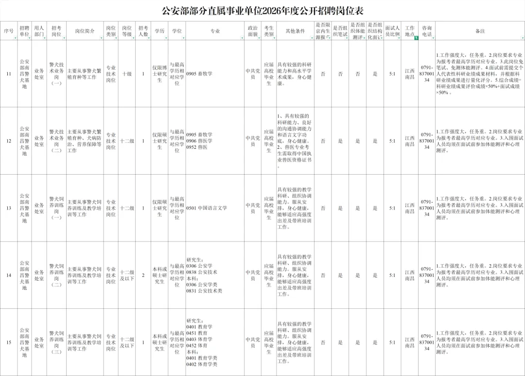 本次公开招聘共设置15个岗位、拟聘用20人,具体岗位信息及资格条件详见《公安部部分直属事业单位2026年度公开招聘岗位表》(见附件)。