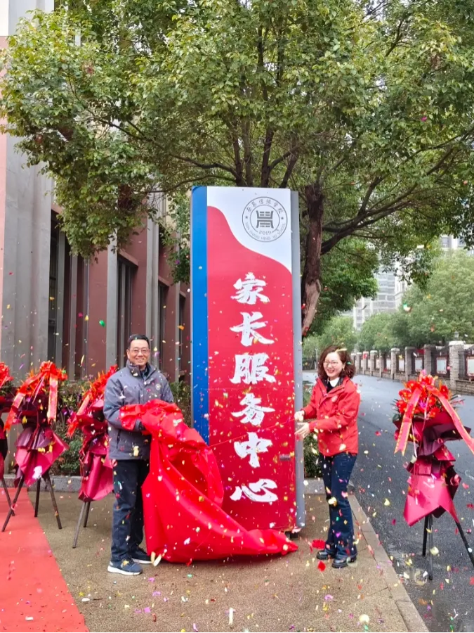 在全体嘉宾的瞩目与掌声中,何源校长与童如洁书记共同为焕新的家长服务中心揭牌!红绸落下,象征家校共育新篇章正式开启。