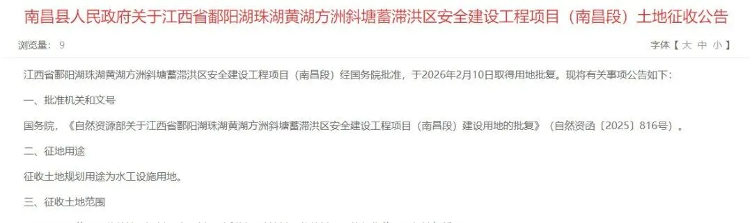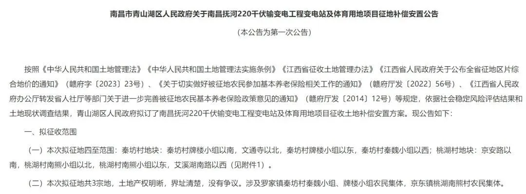 根据南昌县人民政府征收土地预公告(商业用地)2026(3)号公告显示,拟征收三江镇三江村范围内的集体土地。土地面积约17.2095亩。(最终面积以批准面积为准)。拟征地位于X030县道以北、江西三鑫医疗科技股份有限公司以东。涉及三江镇三江村东余组农民集体,具体以土地现状调查确认结果为准。本次拟征收土地目的为:经省人民政府批准由县人民政府组织实施的成片开发建设需要用地的,用于商业用地项目建设。此外,南昌经济技术开发区公布了关于英雄大道快速化改造工程征收土地公告。征地范围为冠山路以东、曰修路以西、英雄大道北侧。征地涉及白水湖管理处北山村,共1管理处1村委会。经调查确认,本次征地总面积2.05亩,其中:农用地2.05亩。