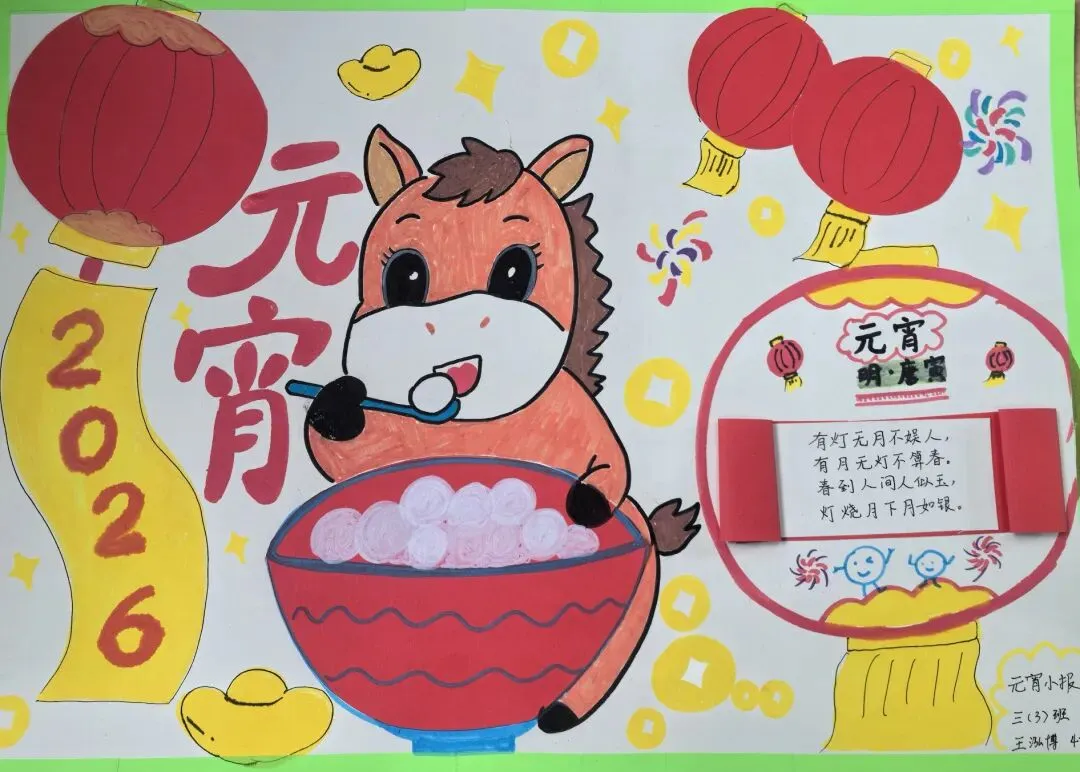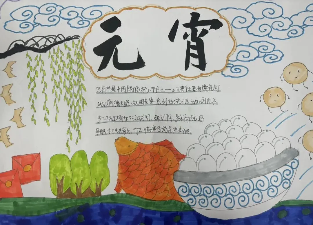 灯火映元宵,童趣绘团圆。元宵佳节期间,学校开展“巧手绘元宵 温情品团圆”活动。同学们围绕元宵节的民俗文化、节日寓意展开手抄报创作,花灯、汤圆、灯谜、祥云等传统元素跃然纸上,画面设计精巧、色彩搭配喜庆,每一幅作品都饱含着同学们对元宵佳节的美好期许,尽显团圆美满的节日氛围。