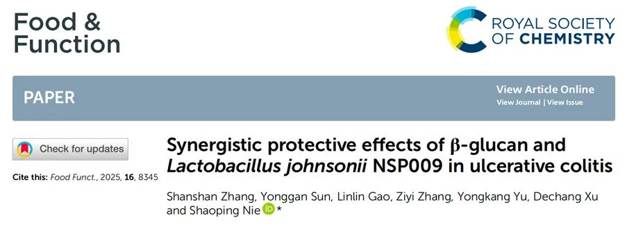 β-葡聚糖与约氏乳杆菌联用,是否能比单一组分产生更好的抗炎效果?近日,南昌大学聂少平教授团队,在国际学术期刊 Food & Function发表了题为“Synergistic protective effects of β-glucan and Lactobacillus johnsonii NSP009 in ulcerative colitis”的封面文章。研究发现,β-葡聚糖与约氏乳杆菌NSP009组成的合生元在改善溃疡性结肠炎方面具有显著的协同增效作用,并对其可能的益生作用途径进行了初步探究。