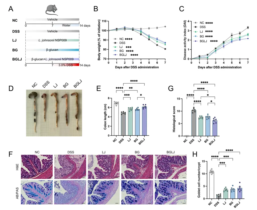 通过DSS诱导的小鼠结肠炎模型,发现相比于单独补充BG或LJ,联合干预组(BGLJ)展现出更好的保护作用:BGLJ干预显著减缓了小鼠的体重下降,降低了疾病活动指数(DAI)。此外,在结肠长度恢复方面,BGLJ组的效果显著优于BG单一干预组。组织病理学分析(H&E和AB/PAS染色)进一步证实,BGLJ能更有效地保护结肠黏膜结构的完整性,减少隐窝损伤,并显著改善杯状细胞的丢失。