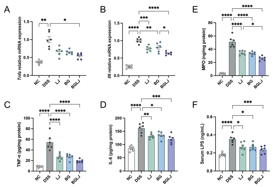 炎症因子的过度表达是UC的核心病理特征。研究发现,BGLJ干预显著下调了结肠组织中促炎因子TNF-α和IL-6的水平。此外,作为反映结肠炎症程度的关键生化指标,髓过氧化物酶(MPO)的水平在BGLJ组中得到了显著抑制,效果均优于单独干预。值得注意的是,BGLJ还显著降低了小鼠血清中脂多糖(LPS)的浓度,这提示该合生元组合不仅在局部发挥抗炎作用,还能降低因肠道通透性增加引起的全身性炎症风险。