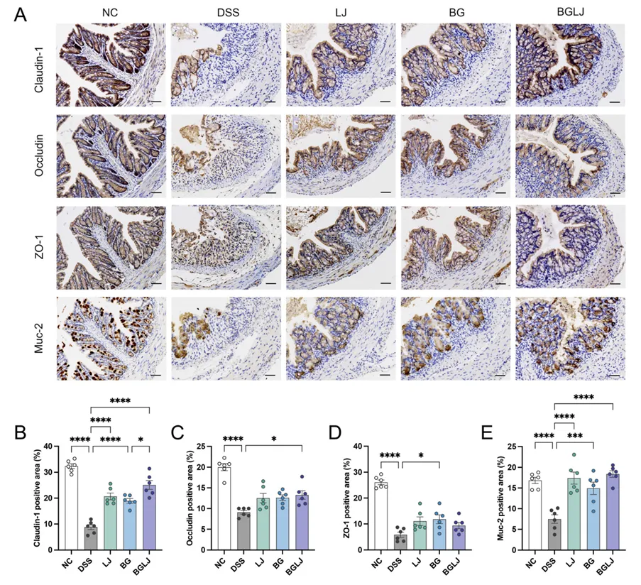 肠上皮屏障受损及通透性增加是UC发病机制的重要环节。免疫组织化学分析表明,DSS诱导导致了紧密连接蛋白(Claudin-1、Occludin、ZO-1)和黏蛋白(Muc-2)水平的大幅下降,意味着肠道屏障遭到严重破坏;BGLJ干预能够显著上调Claudin-1、Occludin以及Muc-2的表达水平。这种协同干预在促进上述关键屏障蛋白表达及恢复粘蛋白水平方面,表现出优于单独使用BG或LJ的效果,证实了其在重塑肠道屏障中的优势。