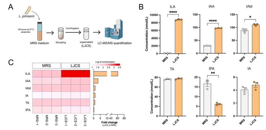 体外培养发现,LJ NSP009能高效产生吲哚-3-乳酸(ILA)。靶向代谢组学数据显示,ILA是该菌产生的主要吲哚衍生物之一。
