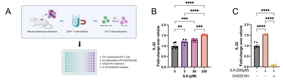 在体外细胞实验中,观察到ILA能够以剂量依赖的方式促进Th17细胞分泌细胞因子IL-22。而当加入芳香烃受体(AhR)拮抗剂后,这种促进作用被抑制,这提示ILA可能通过激活AhR途径来调节免疫因子的产生。